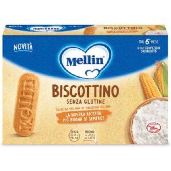 Mellin Biscottino Senza Glutine dal 6° mese, 500g Mellin MellinBISCOTTINO Descrizione Biscottino senza glutine, buono da solo e nel latte. Ingredienti Amido di mais (57%), zucchero, fecola di patate, olio di semi di girasole, maltodestrine, miele di acacia (1,3%), agenti lievitanti: bicarbonati di ammonio, bicarbonati di sodio; aromi, emulsionante: lecitina di girasole; vitamina B1. Può contenere latte, uova, soia. Senza glutine. Caratteristiche nutrizionali Valori medi per 100 g %VNR% Energia 1853 kJ / 440 kcal Grassi di cui acidi grassi saturi 12 g 1,0 g Carboidrati di cui zuccheri 82 g 22 g Proteine 0,5 g Sale 0,135 g Tiammina (vitamina B1) 0,9 mg 180% %VNR: Valori Nutritivi di Riferimento Modalità d’uso Il Biscottino senza glutine è indicato per essere sciolto nel latte a partire dal 6° mese, all’interno di una dieta varia ed equilibrata, secondo le indicazioni del Pediatra. Per una miglior solubilità nel biberon utilizzare il latte tiepido ed agitare bene. Conservazione Conservare in luogo asciutto. Validità a confezionamento integro: 13 mesi. Formato Confezione da 500 g. Cod 77880